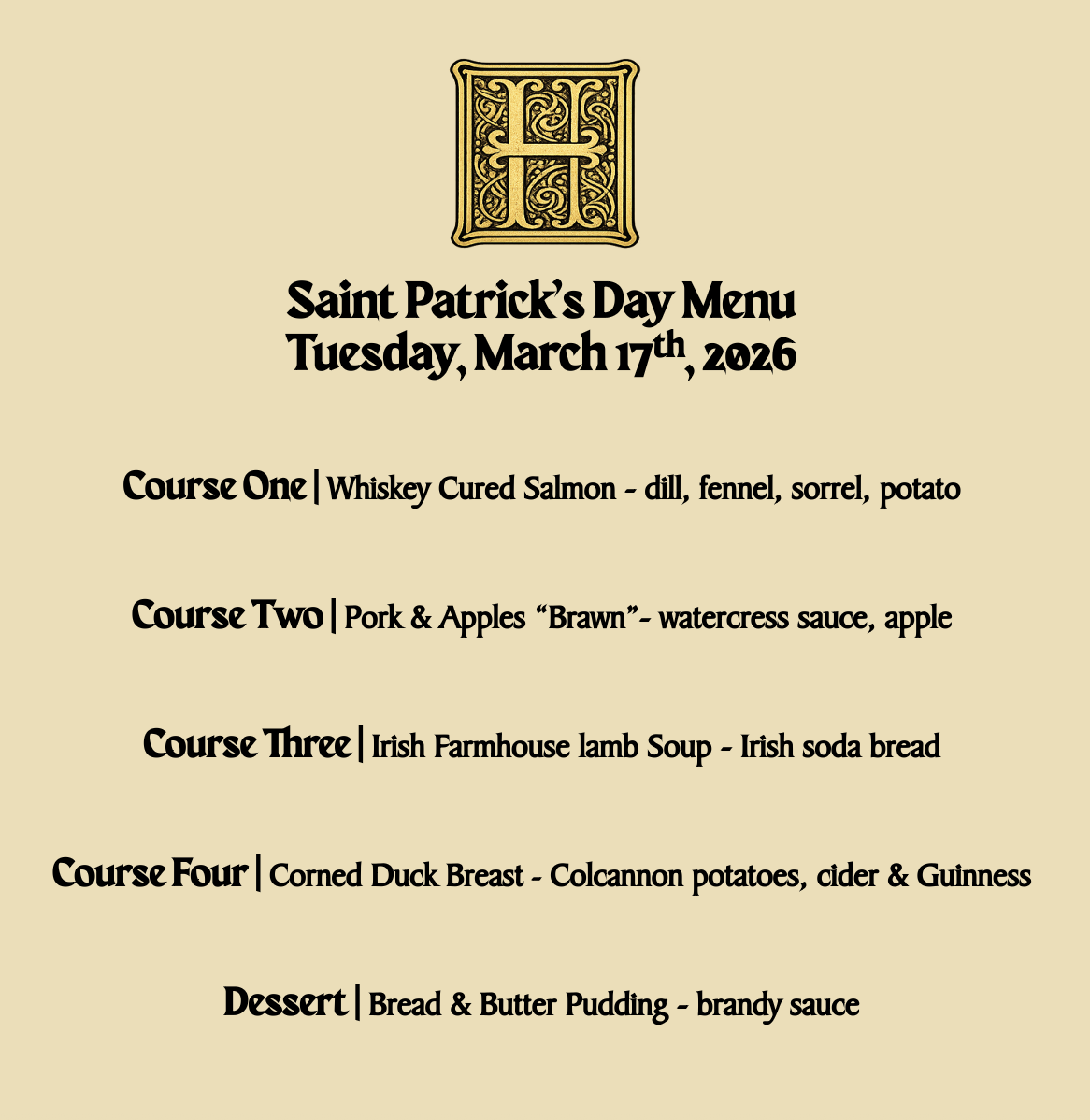St. Patrick’s Day at Hyeholde is an evening rooted in Irish tradition, thoughtful cooking, and quiet celebration. This special menu honors the foodways of Ireland through a contemporary lens - simple, familiar ingredients treated with care, restraint, and respect for seasonality.