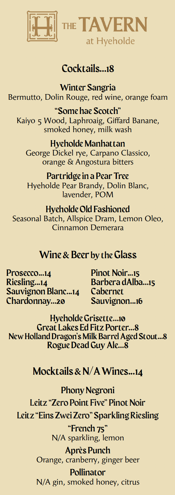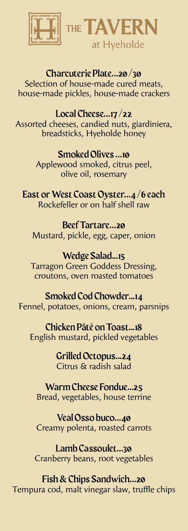 The Tavern has its own menu and its own rhythm, while remaining unmistakably Hyeholde.